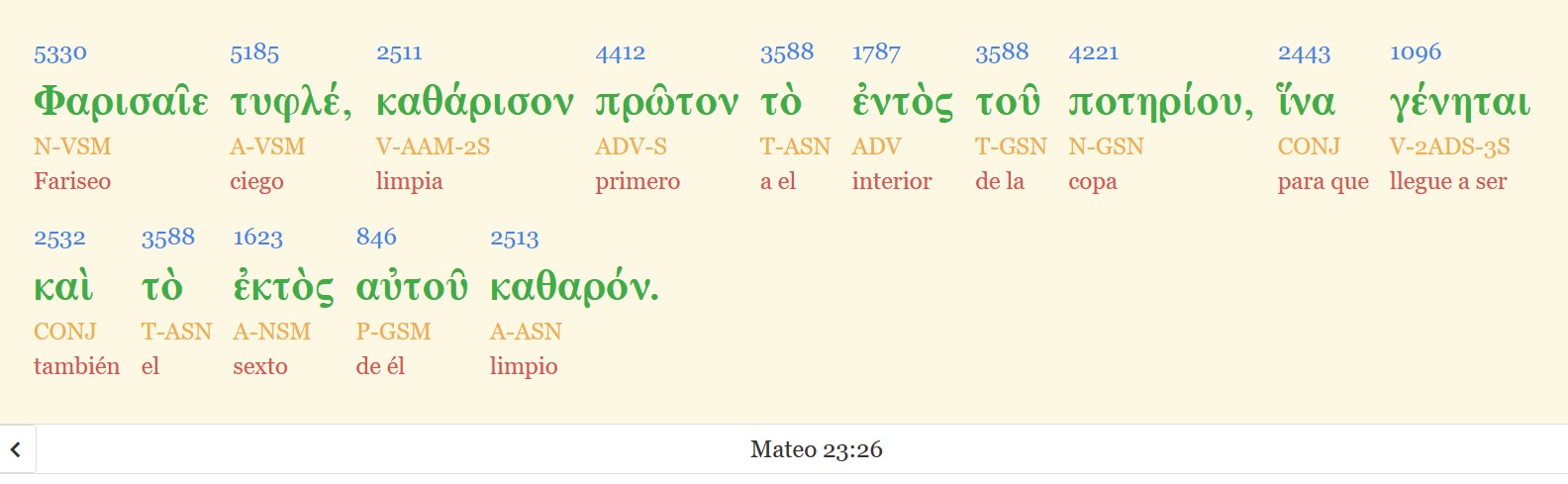 (RV1960+) ni G3761 B dirán: G2046 VFAI3P Helo G2400 VAAM2S aquí, G5602 B o G2228 T helo G2400 VAAM2S allí; G1563 B porque G1063 C he aquí G2400 VAAM2S el G3588 DNSF reino G932 NNSF de Dios G3588 G2316 DGSM NGSM está G2076 VP-I3S entre G1787 B vosotros. G5216 RP2GP