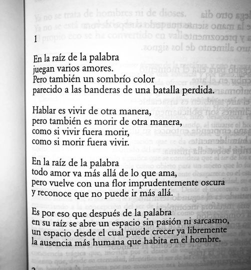 “Sin misterio, todo sería muy poco, tal vez nada. Y creador del misterio es el poeta, pero el poeta como Roberto Juarroz, uno de los mayores poetas de nuestro tiempo. Es difícil elogiar a quien merece más que elogios. En estos poemas cualquier palabra podría ser la última, hastra la primera. Y sin embargo lo último sigue.”