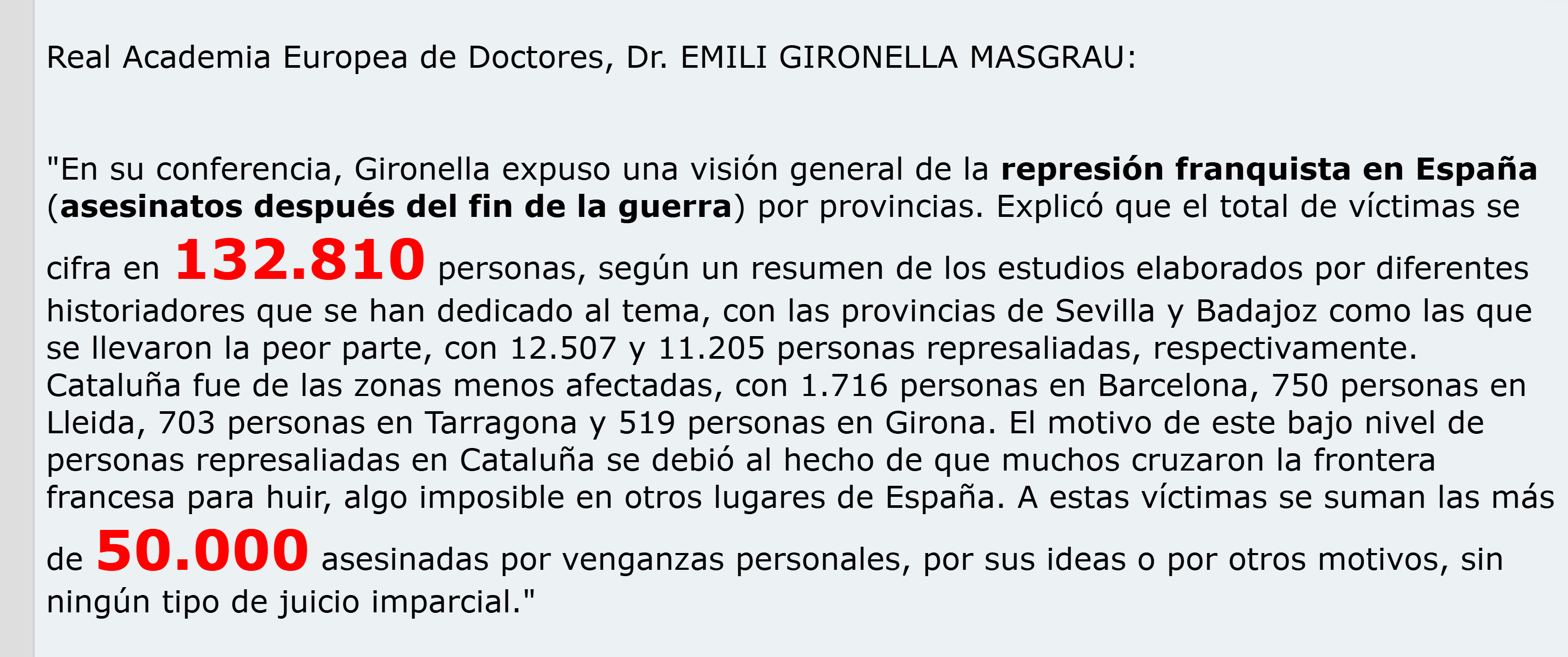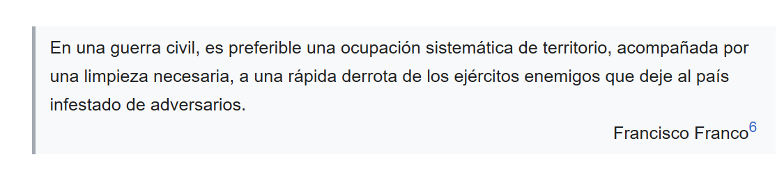 Soy apolítico (bueno, más bien, no voto, pero no soy apolítico: me guste o no, vivo en s[o-u]ciedad) y tengo muy pocos conocimientos de historia pero creo que, a grandes rasgos y con la salvedad hecha de que aquello fue una guerra y las guerras sacan lo peor del Ser Humano en cualquier bando, me da la sensación de que el bando franquista fue más psicópata que el republicano. Y definitivamente -a los datos expuestos arriba me remito- lo fue concluida la guerra.