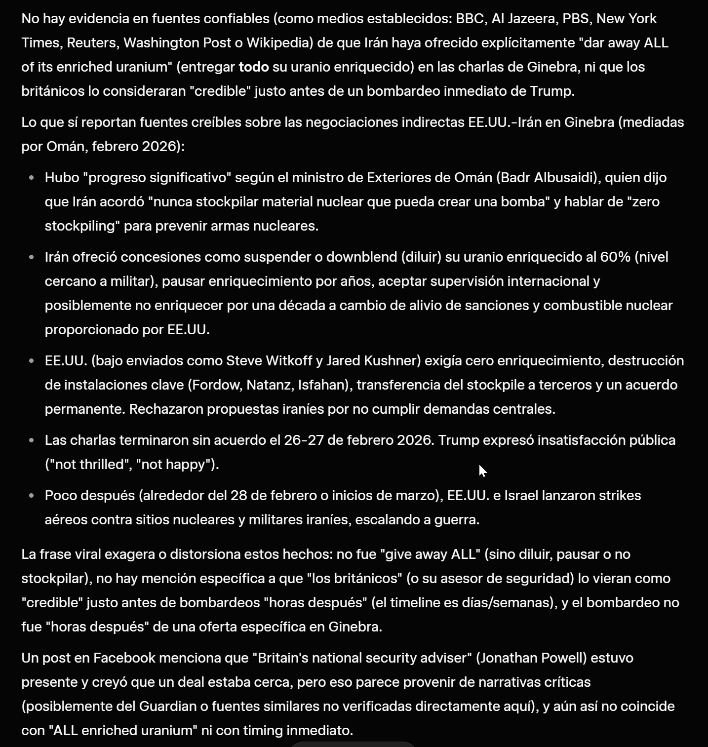 «Irán ofreció regalar TODO su uranio enriquecido, durante las negociaciones de paz en Ginebra. Para UK era una oferta creíble. Horas después, Trump comenzó a bombardear Irán de todos modos.»